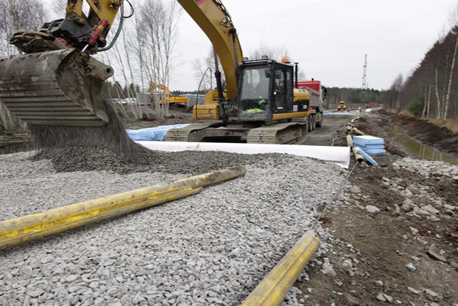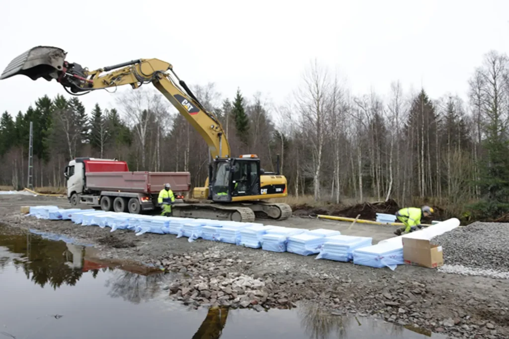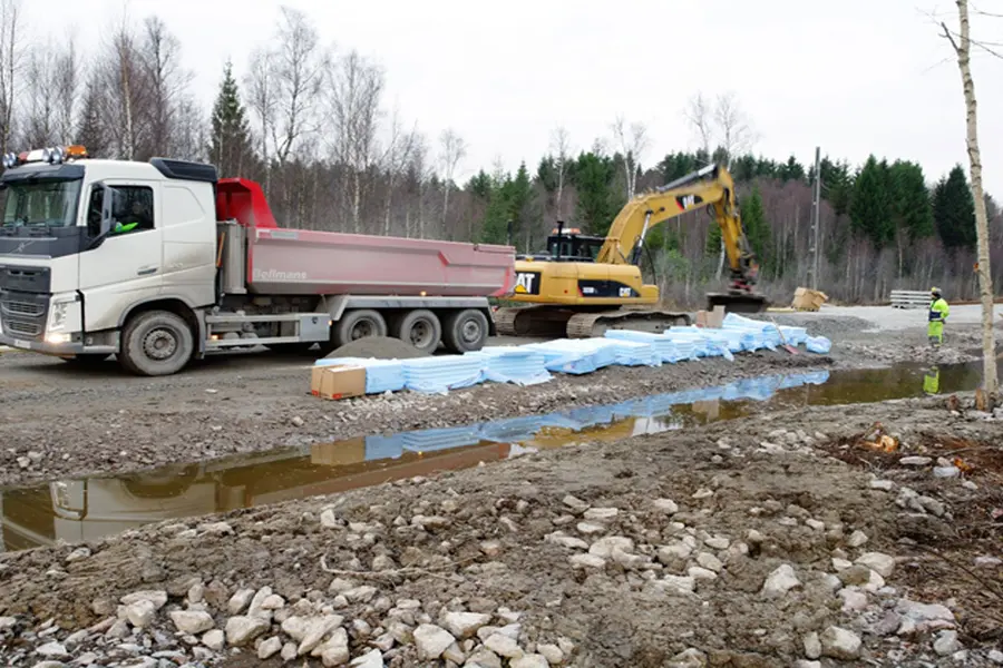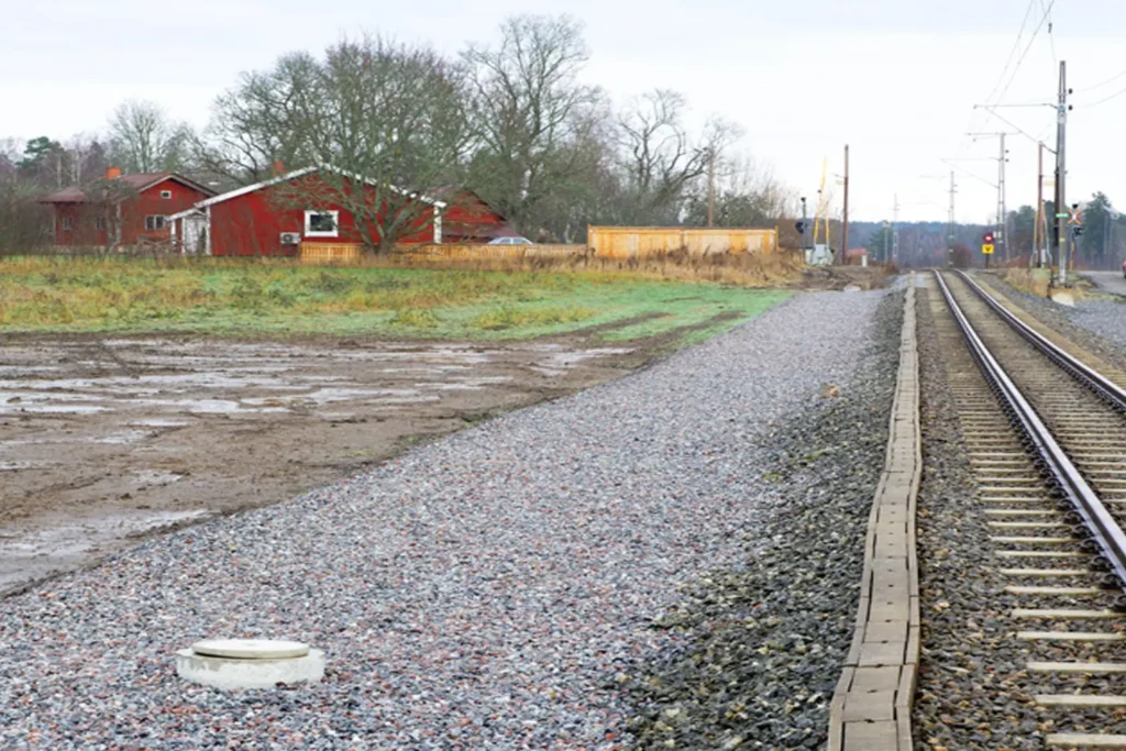 Kärnan i uppdraget utgjordes av tekniskt krävande jordförstärkning och schakt för terrassbotten, följt av en noggrann återuppbyggnad med förstärknings- och ballastlager samt ny spåranläggning. För att säkra anläggningens långsiktiga hållbarhet utfördes även dräneringsarbeten, dikning och motfyllnad av järnvägsbanken längs hela sträckan.